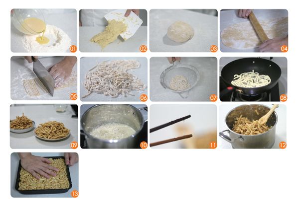 5.将大面片裁成若干小面片,再将小面片切成如图所示的细条(俗称坯条)。切的时候注意撒上一些玉米淀粉,以防止切好的坯条粘在一起。
