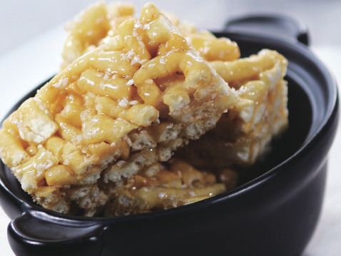 14.等萨其马完全冷却,黏合在一起以后,脱模并切成小块即可。