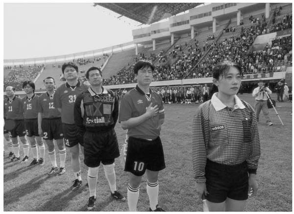 记得决赛还剩十几分钟的时候,我不得不下场,因为当天晚上在八达岭长城举行残奥会吉祥物的揭晓晚会,我要主持。驱车几十公里到那里,主持完毕,又驱车几十公里回城,队友们的庆功酒席还没散,我一进屋,桌子的中央摆着属于我的“最佳射手”奖杯,周围是和我进球数相同的九杯啤酒,我只好一次性地全部干掉。这一年,我三十八岁,这个冠军也自然让我难忘。记得那年年底有记者采访我:这一年什么事最难忘?我的回答不是国家大事,而是足球场上的冠军。它在告诉我自己也提示着别人:我们的身体比我们想象的更有潜力,你有规律地激活它,它就会回报你。