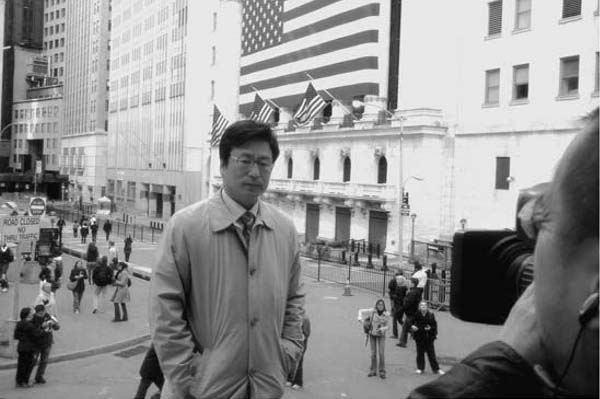 我站在华尔街的高台上做报道,背后挂着美国国旗的建筑,就是纽约证券交易所,只不过当时正休市。我身后有很多旅游者,仔细看,大多拿着相机,在这特殊时刻,能照出一个不一样的华尔街吗?