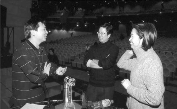 第二天就要正式录制了,这是头一天在空旷场地内临时召开的不用坐着开的会,制片人朱波、敬大姐和我,再加上导演,设想一下明天的诸种可能。看这张照片,轻松是主基调。没有松弛,没有民主,没有对干活人的信任,是不会有好节目的。