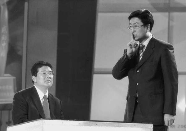 我似乎正做着一个奇怪的手势,是劝谁闭嘴呢?其实,我没这么不礼貌,是在讲一个故事。照片上的另一位叫田世国,捐肾救母,手术时,他谎称出差在外,并告诉兄弟姐妹,不许对他母亲说。我这个手势,估计是正讲到这儿,我们这期节目,也是不会让他母亲看到的,至今老人仍蒙在鼓里。