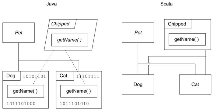 Scala要求在子类中必须给父类构造方法中出现的参数赋值。但在特质中声明的方法都会被子类继承。这样就减少了重复实现。你看,Cat和Dog类都要给参数name赋值。两个子类都可以访问Chipped中的实现——在此例中,参数chipName可以用来保存写在芯片上的宠物的名字。