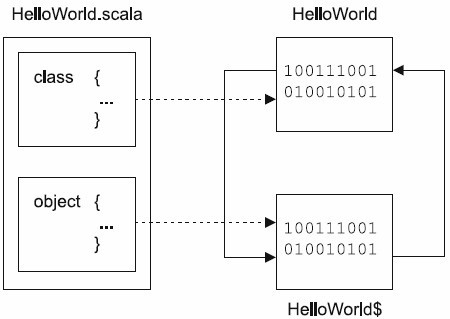 如果这是Java,你会觉得这段代码应该变成一个HelloWorld.class文件。实际上,Scala会把它编译成两个文件:HelloWorld.class和HelloWorld$.class。