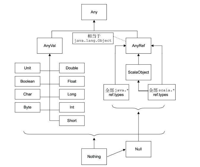 从图中可以看到,Unit和其他值类型在Scala中都是正确的类型。AnyRef类相当于java.lang.Object。每次见到AnyRef,你都应该在心里把它换成Object。它之所以没叫Object,是因为Scala也要运行在.NET运行时平台上,所以它要给这个概念再起个名字。