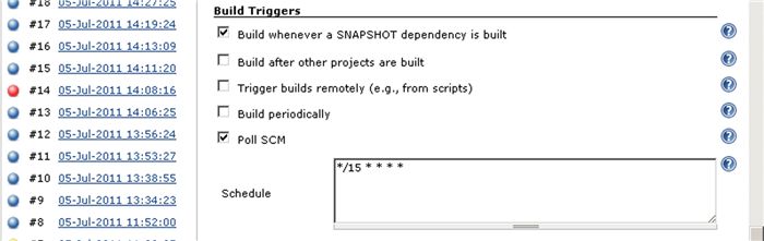 我们对java7developer项目的设置,只是要求Jenkins每隔15分钟轮询SVN一次,如图12-7所示。