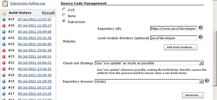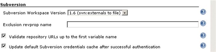 现在Maven配置好了,需要告诉Jenkins你用什么版本控制资源库。这在配置页的下面。找到单词SVN。