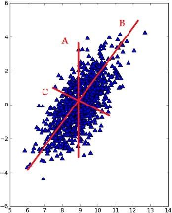 在选择了覆盖数据最大差异性的坐标轴之后,我们选择了第二条坐标轴。假如该坐标轴与第一条坐标轴垂直,它就是覆盖数据次大差异性的坐标轴。这里更严谨的说法就是正交(orthogonal)。当然,在二维平面下,垂直和正交是一回事。在图13-1中,直线C就是第二条坐标轴。利用PCA,我们将数据坐标轴旋转至数据角度上的那些最重要的方向。