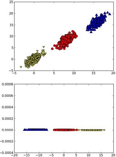 图13-2 二维空间的3个类别。当在该数据集上应用PCA时,就可以去掉一维,从而使得该分类问题变得更容易处理