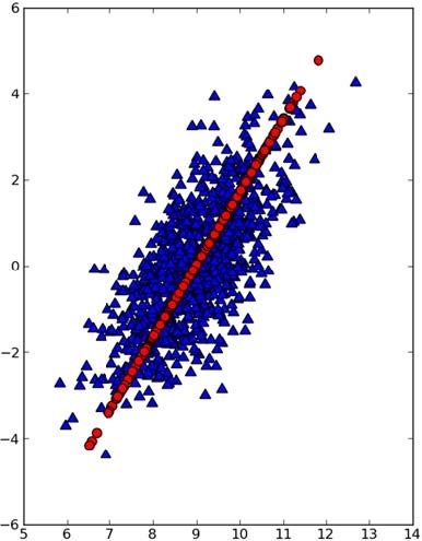 图13-3 原始数据集(三角形点表示)及第一主成分(圆形点表示)