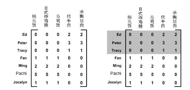 我们对上述矩阵进行SVD处理,会得到两个奇异值(读者如果不信可以自己试试)。因此,就会仿佛有两个概念或主题与此数据集相关联。我们看看能否通过观察图中的0来找到这个矩阵的具体概念。观察一下右图的阴影部分,看起来Ed、Peter和Tracy对“烤牛肉”和“手撕猪肉”进行了评级,同时这三人未对其他菜评级。烤牛肉和手撕猪肉都是美式烧烤餐馆才有的菜,其他菜则在日式餐馆才有。
