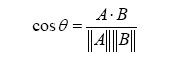 另一个常用的距离计算方法就是余弦相似度(cosine similarity),其计算的是两个向量夹角的余弦值。如果夹角为90度,则相似度为0;如果两个向量的方向相同,则相似度为1.0。同皮尔逊相关系数一样,余弦相似度的取值范围也在-1到+1之间,因此我们也将它归一化到0到1之间。计算余弦相似度值,我们采用的两个向量A和B夹角的余弦相似度的定义如下: