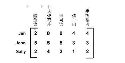 我们希望拥有一些物品之间相似度的定量方法。那么如何找出这些方法呢?倘若我们面对的是食品销售网站,该如何处理?或许可以根据食品的配料、热量、某个烹调类型的定义或者其他类似的信息进行相似度的计算。现在,假设该网站想把业务拓展到餐具行业,那么会用热量来描述一个叉子吗?问题的关键就在于用于描述食品的属性和描述餐具的属性有所不同。倘若我们使用另外一种比较物品的方法会怎样呢?我们不利用专家所给出的重要属性来描述物品从而计算它们之间的相似度,而是利用用户对它们的意见来计算相似度。这就是协同过滤中所使用的方法。它并不关心物品的描述属性,而是严格地按照许多用户的观点来计算相似度。图14-3给出了由一些用户及其对前面给出的部分菜肴的评级信息所组成的矩阵。