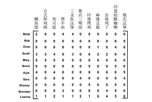 图14-4 一个更大的用户-菜肴矩阵,其中有很多物品都没有评分,这比一个全填充的矩阵更接近真实情况