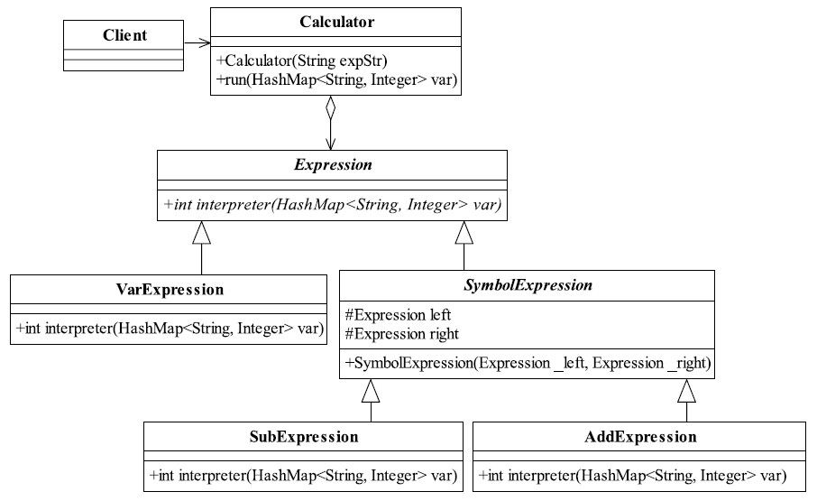 public class Calculator { //定义表达式 private Expression expression; //构造函数传参,并解析 public Calculator(String expStr){ //定义一个栈,安排运算的先后顺序 Stack<Expression> stack = new Stack<Expression>; //表达式拆分为字符数组 char charArray = expStr.toCharArray; //运算 Expression left = null; Expression right = null; for(int i=0;i<charArray.length;i++){ switch(charArray[i]) { case \'+\': //加法 //加法结果放到栈中 left = stack.pop; right=new VarExpression(String.valueOf(charArray[++i])); stack.push(new AddExpression(left,right)); break; case \'-\': left = stack.pop; right=new VarExpression(String.valueOf(charArray[++i])); stack.push(new SubExpression(left,right)); break; default: //公式中的变量 stack.push(new VarExpression(String.valueOf(charArray[i]))); } } //把运算结果抛出来this.expression = stack.pop; }//开始运算 public int run(HashMap<String,Integer> var){return this.expression.interpreter(var); }} 方法比较长,我们来分析一下,Calculator构造函数接收一个表达式,然后把表达式转化为char数组,并判断运算符号,如果是“+”则进行加法运算,把左边的数(left变量)和右边的数(right变量)加起来就可以了,那左边的数为什么是在栈中呢?例如这个公式:a+b-c,根据for循环,首先被压入栈中的应该是有a元素生成的VarExpression对象,然后判断到加号时,把a元素的对象VarExpression从栈中弹出,与右边的数组b进行相加,b又是怎么得来的呢?当前的数组游标下移一个单元格即可,同时为了防止该元素再次被遍历,则通过++i的方式跳过下一个遍历——于是一个加法的运行结束。减法也采用相同的运行原理。