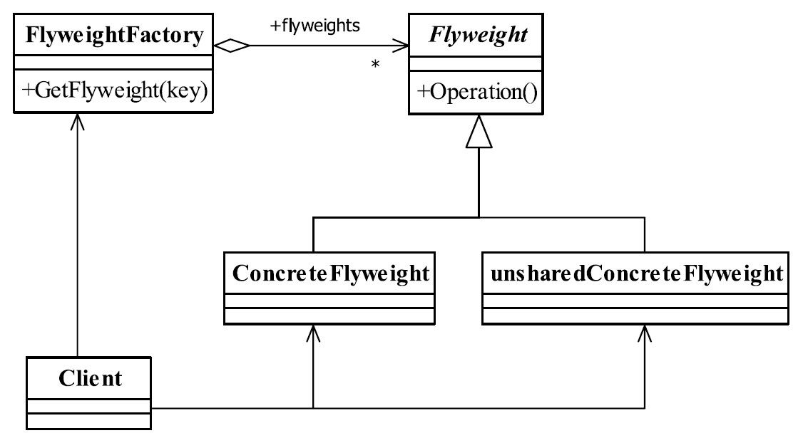 public class FlyweightFactory { //定义一个池容器 private static HashMap<String,Flyweight> pool= new HashMap<String,Flyweight>; //享元工厂 public static Flyweight getFlyweight(String Extrinsic){ //需要返回的对象 Flyweight flyweight = null; //在池中没有该对象 if(pool.containsKey(Extrinsic)){ flyweight = pool.get(Extrinsic); }else{ //根据外部状态创建享元对象 flyweight = new ConcreteFlyweight1(Extrinsic); //放置到池中 pool.put(Extrinsic, flyweight); } return flyweight; }}