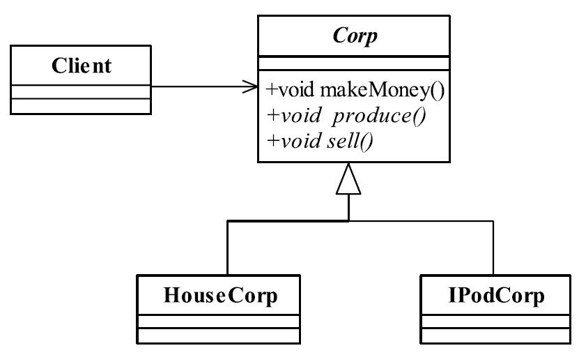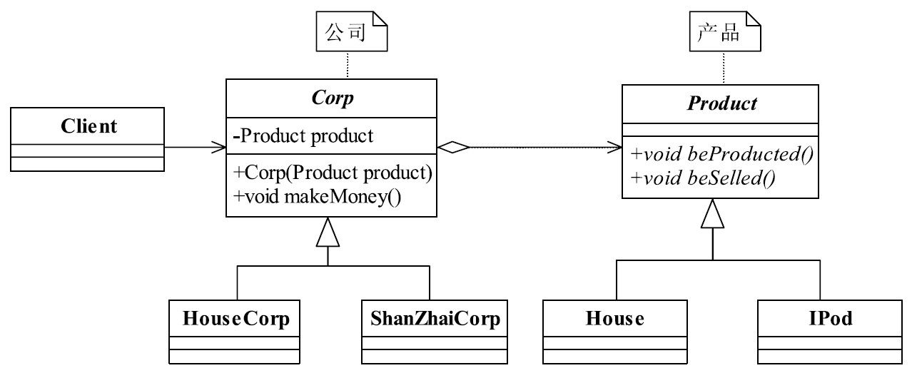 public class Client { public static void main(String args) { System.out.println(\"-------房地产公司是按这样运行的-------\"); //先找到我的公司 HouseCorp houseCorp =new HouseCorp; //看我怎么挣钱 houseCorp.makeMoney; System.out.println(\"n\");System.out.println(\"-------山寨公司是按这样运行的-------\"); IPodCorp iPodCorp = new IPodCorp; iPodCorp.makeMoney; }} 确实,只用修改了黑色字体这几句话,服装厂就开始变成山寨iPod生产车间,然后你就看着你的财富在积累。山寨的东西不需要特别的销售渠道(正品到哪里我就到哪里),不需要维修成本(大不了给你换个,你还想怎么样,过了高峰期我就改头换面了,你找谁维修去?投诉?投诉谁呢?),不承担广告成本(正品在打广告,我还需要吗?需要吗?),但是也有犯愁的时候,这是一个山寨工厂,要及时地生产出市场上流行的产品,转型要快,要灵活,今天从生产iPod转为生产MP4,明天再转为生产上网本,这都需要灵活的变化,不要限制得太死!那问题来了,每次我的厂房,我的工人,我的设备都在,不可能每次我换个山寨产品厂子就彻底不要了。这不行,成本忒高了点,那怎么办?