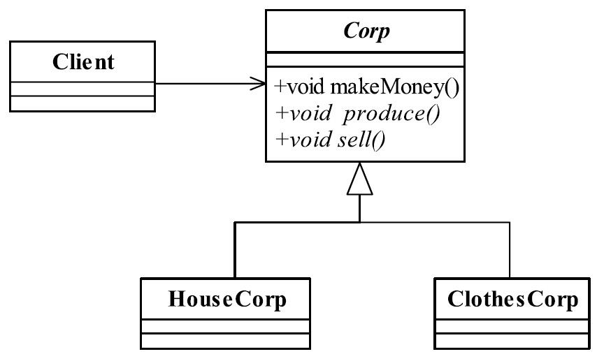 public class Client { public static void main(String args) { System.out.println(\"-------房地产公司是这样运行的-------\"); //先找到我的公司 HouseCorp houseCorp =new HouseCorp; //看我怎么挣钱 houseCorp.makeMoney; System.out.println(\"n\"); System.out.println(\"-------服装公司是这样运行的-------\"); ClothesCorp clothesCorp = new ClothesCorp; clothesCorp.makeMoney; }} 这段代码很简单,运行结果如下所示: