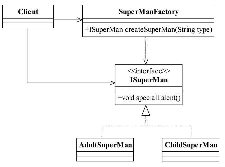 public class ChildSuperMan implements ISuperMan { //超能先生的三个孩子 public void specialTalent { System.out.println(\"小超人的能力是刀枪不入、快速运动\"); }} 产品都具备,那我们编写一个工厂类,其意图就是生产超人,具体是成年超人还是未成年超人,则由客户端决定,如代码清单30-4所示。