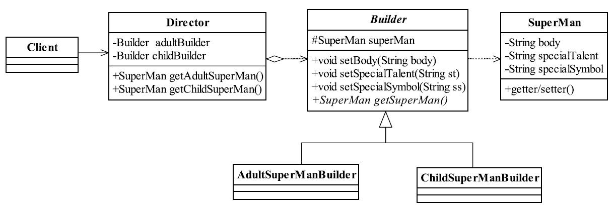 public class ChildSuperManBuilder extends Builder { @Override public SuperMan getSuperMan { super.setBody(\"强壮的躯体\"); super.setSpecialTalent(\"刀枪不入\"); super.setSpecialSymbol(\"胸前带小S标记\"); return super.superMan; }} 大家注意看我们这两个具体的建造者,它们都关注了产品的各个部分,在某些应用场景下甚至会关心产品的构建顺序,即使是相同的部件,装配顺序不同,产生的结果也不同,这也正是建造者模式的意图:通过不同的部件、不同装配产生不同的复杂对象。我们再来看导演类,如代码清单30-10所示。