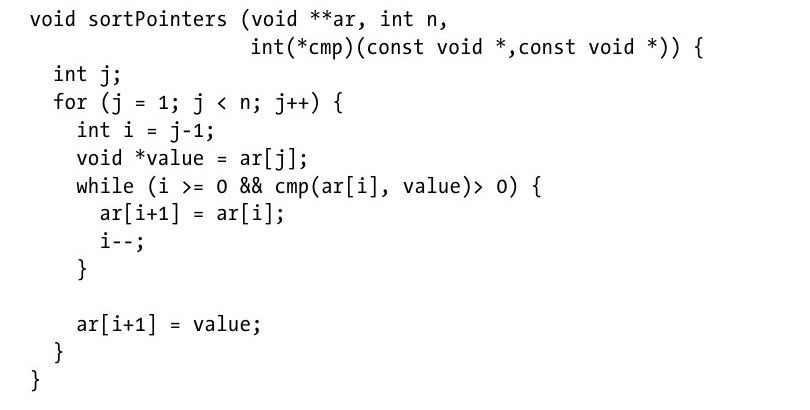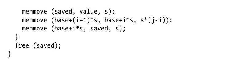 当数据使用指针进行存储时,例4-1的C程序对一个数组ar进行排序,并且其中的元素可以用提供的比较函数cmp进行比较。 例4-1:基于指针的插入排序 当A是基于值的形式存储时,这个数组被装入n行,并且分配给它一个固定大小的内存s。使用比较函数对值进行比较,也就是将值从一个位置复制到另外一个位置(比较函数的栈中)。例4-2给出了一个C程序,这个程序使用了memmove来高效地移动数据。 例4-2:基于值的插入排序