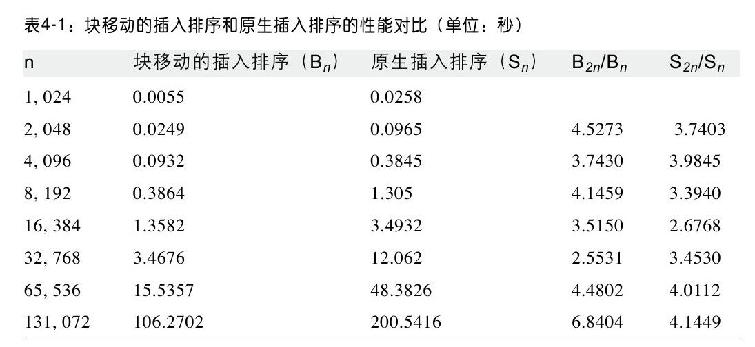 插入排序对于基于值的数据效率很低,因为很多内存需要移位,以给新的值腾出位置。表4-1包含了在直接比较。我们将会执行10次随机实验,排序n个元素,最好和最坏结果将会被抛弃。这个表给出了剩余8次结果的平均值。注意这个实现是如何通过内存块移动而不是通过单独的内存交换来改善性能的。当数组大小加倍的时候,执行时间大约也会乘以4,整好验证了插入算法的O(n2)性能。即使使用了内存块移动来改善性能,插入排序仍然是二次的,因为使用内存块移动的插入排序的性能是原生插入排序性能的常数倍(大约1/7)。插入排序的问题是它是一种保守的算法(叫做本地移位排序),这类算法每个元素一次移动一个位置。