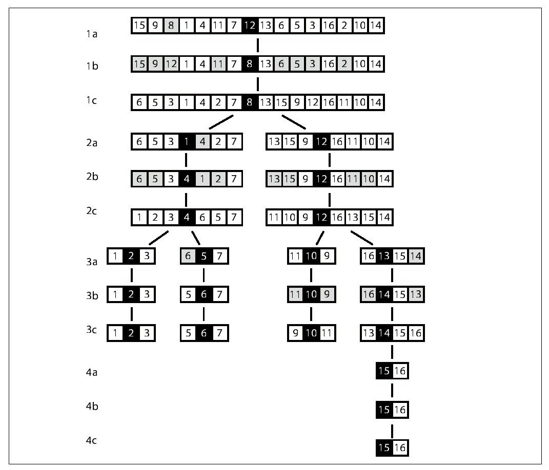 图 4-9 在一个小数组上进行中值排序行1a表示最初的无序数组,中值元素A[me]被用灰色方块标示出来。在行1b中,A[me]和中位元素(黑色方块表示)进行交换,然后大于中值元素的元素(行1b中点左边的灰色方格)和小于等于中值元素的元素(行1b中点右边的灰色方格)互换,得到行1c中的分割后的数组。在递归的每一步,每一个子数组都会被排序,行2a~2c,3a~3c和4a~4c表示了这个过程。