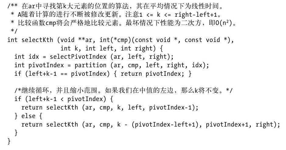 这个定义反复地在递归中使用,不过它也能够迭代地在一个循环而不是在一个尾递归函数中定义(可以参考代码库中的这个例子)。selectKth是一个平均时间为线性的函数,给定一个适当的pivotIndex,其返回了数组ar中的第k个元素,例4-4是它的一个实现。
