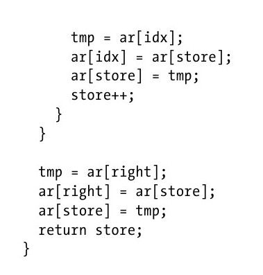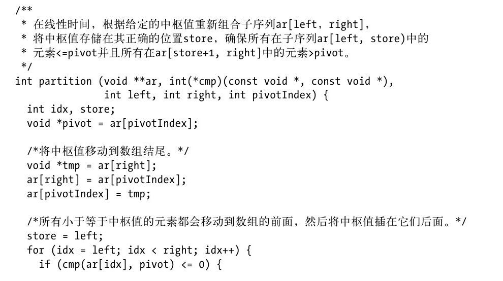 使用中值排序的关键在于高效地从无序数组中选择出中值元素。我们先不回答这个问题,我们来看看另一个在计算机科学中非常典型的问题,这个问题最终能够给我们的初始问题一个很好的解决方案。想象一下一个人给了你一个函数p=partition(left,right,pivotIndex),这个函数将元素A[pivotIndex]作为一个特殊的中枢值,其将数组A[left,right]分成两半,其中一半中所有元素都小于等于中值元素,另一半的所有元素都大于等于中值元素。注意left≤pivotIndex≤right,返回值p是p在子序列A[left,right]的最终位置。例4-3是这个partition函数的C实现。