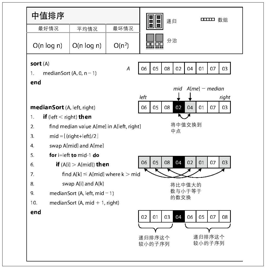 在计算机科学中,分治是一种非常常见的方法,它将一个问题分成两个独立的子问题,每个子问题的规模是原始问题规模的一半。下面让我们来看看中值排序(图4-8),在对一个包含有n≥1个元素的数组A排序时,它交换中值元素A[me]和A的中位元素(第2~4行),将数组分成左右各一半。中值排序然后将左边大于A[mid]的元素和右边小于等于A[mid]的元素互换(第5~8行)。这样将原始数组细分成两个不同的子数组,每一个子数组的大小是原始大小的一半,这两个子数组也同样需要排序。中值排序就这样递归地应用在每一个子数组上(第9~10行)。