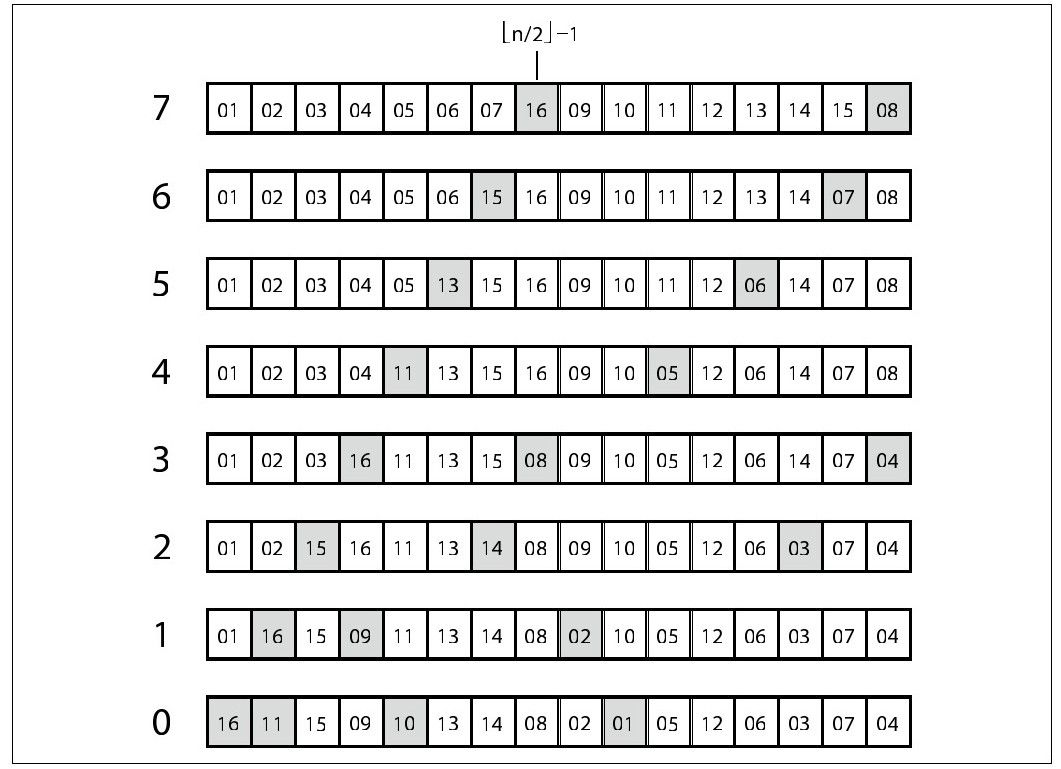 堆排序在排序数组的时候,首先会将数组中的元素放到堆中“合适的位置”。事实上,图4-15所示的堆是在一个已经有序的数组上执行build Heap(图4-14有这个函数的伪代码)得到的结果。buildHeap执行的过程如图4-16所示。如果A[i]的两个子节点A[2*i+1]和A[2*i+2]至少有一个比A[i]大,heapify(A,i,n)通过交换A[i]和两个子节点中较大的来更新A。如果交换过程发生了,heapify递归地检查其孙子节点来正确地维护A的堆性质。你能够看到,在结果堆中,最终大数会被“抬升”(意思是它们会和左边的较小元素交换)。图4-16灰色的方格描述了heapify在第9行被交换的元素。