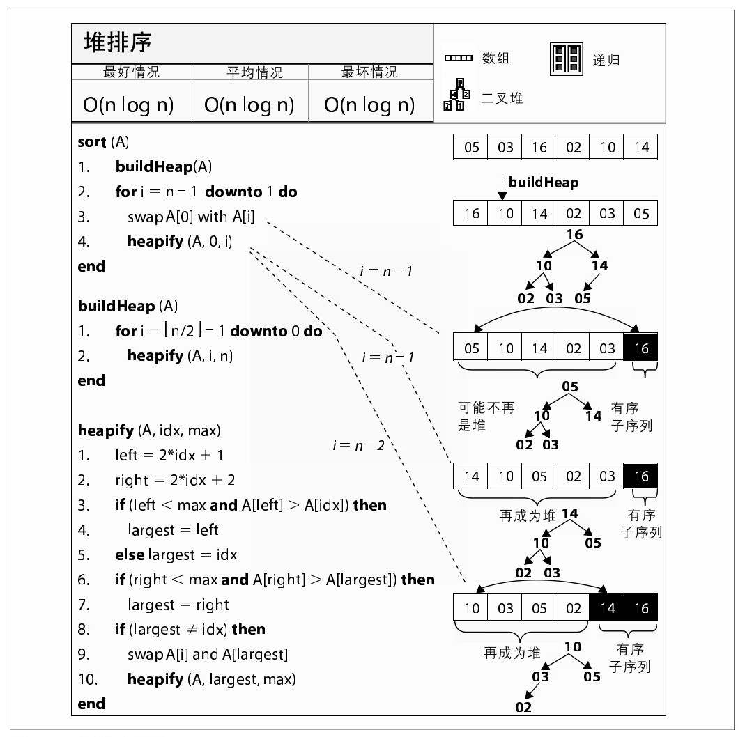 图 4-16 在一个初始有序的数组上执行buildHeap操作在排序一个大小为n的数组A,堆排序将其切分成两个相异的子数组,A[0,m)和A[m,n),分别表示一个大小为m的堆和一个有n-m个元素的有序子数组。随着i从n-1迭代到1,堆排序交换堆中的最大元素(位置是A[0])和A[i],使子数组A[i,n)的大小不断增长;然后堆排序执行heapify重构A[0,i)使其成为一个有效堆(图4-14描述了伪代码)。结果非空子数组A[i,n)将会有序,因为堆中的最大的元素保证比这个有序子数组中的任何一个元素都要小。