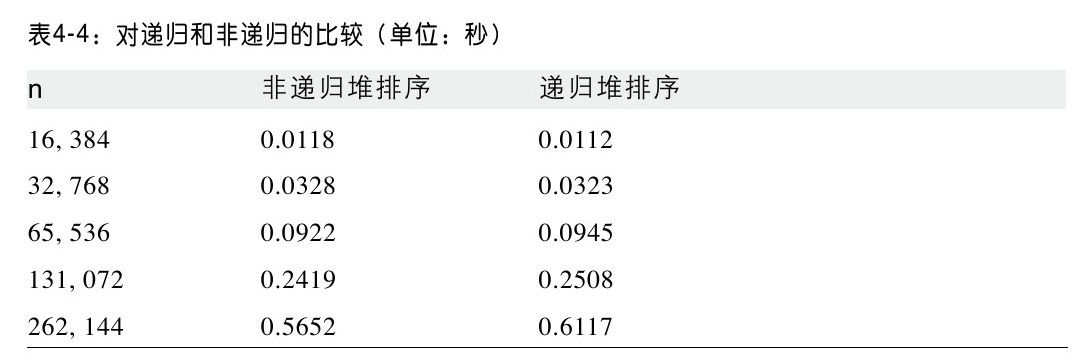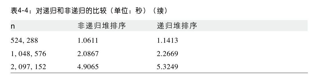 也有一些非递归的堆排序实现,表4-4列出了对两种实现执行1000个随机测试的结果,抛弃了最好和最坏的结果。剩余结果的平均值如表4-4所示。