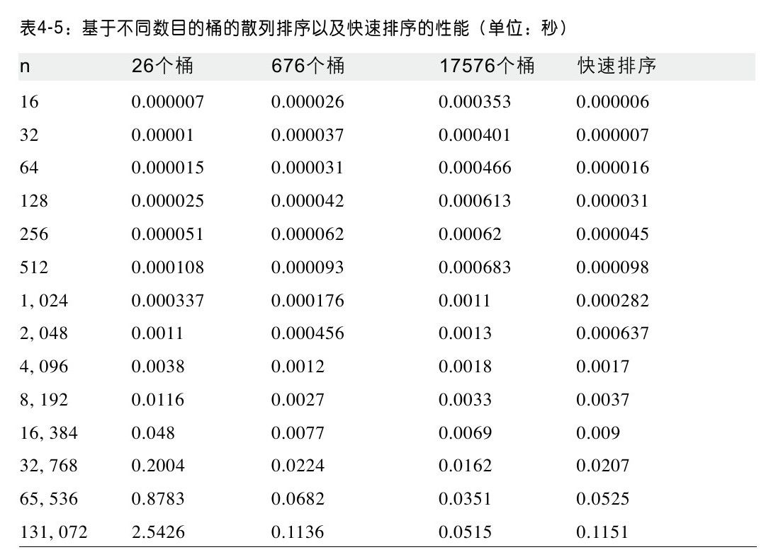 注意在17 576个桶,n>8192个元素的情况下,散列排序的性能要优于快速排序(并且这个趋势随着n的增长继续保持)。但是,仅仅只有676个桶,n>32768(平均每个桶48个元素)的话,散列排序随着数据集的增长,执行插入排序的开销也不断增长,速度越来越慢。事实上,在26个桶,n>256的情况下,随着n的加倍,散列排序所需的时间增加3倍,在桶很少时,散列排序的性能是O(n2)。