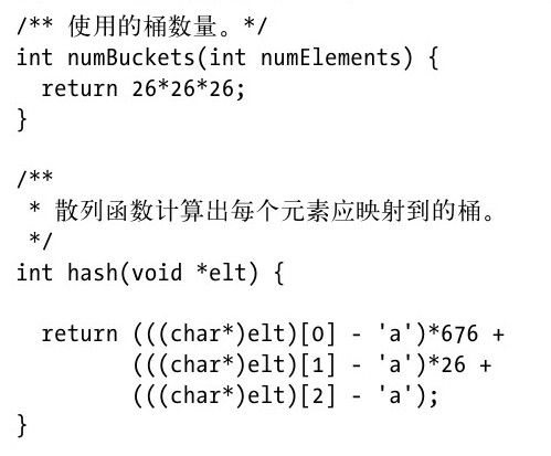 例4-13定义了散列函数hash(e),这个函数计算仅仅包含了小写字母的元素。它将字符串的前三个字符转换成一个值(基准值为26),对于字符串"abcdefgh",它的前三个字符("abc")被抽取出来然后转换得0*676+1*26+2=28。这个字符串将插入到标为28的桶中。