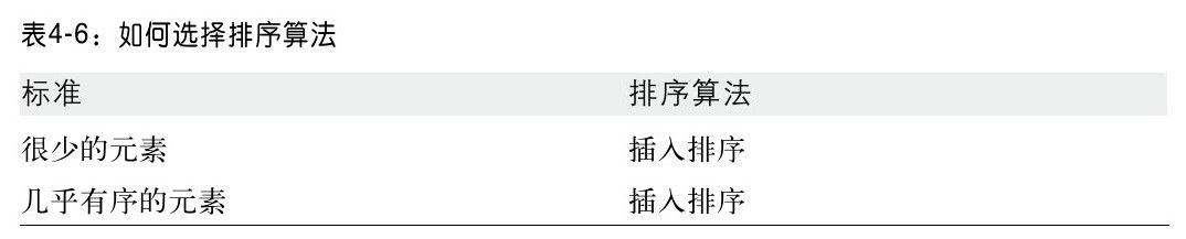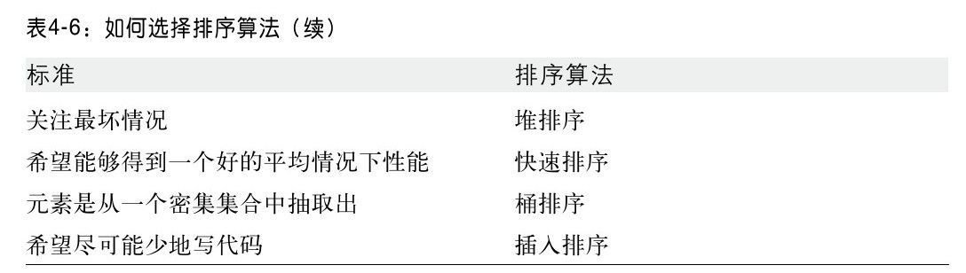 选择一个排序算法时,考虑表4-6的定性标准。这些标准可能能够帮你做出最初的决定,但是你需要更多量化标准作为指引。