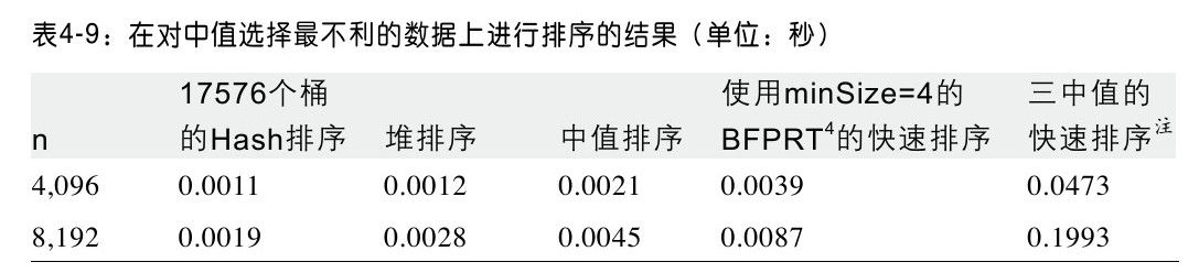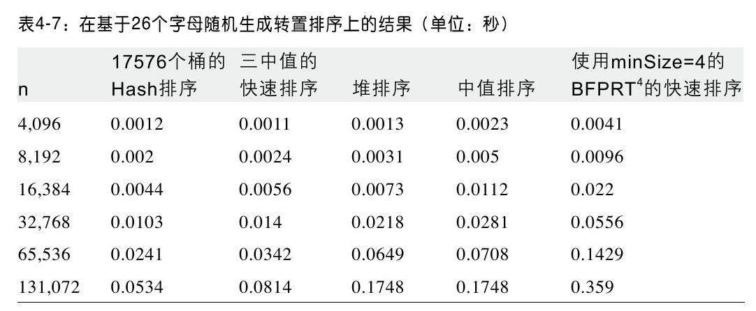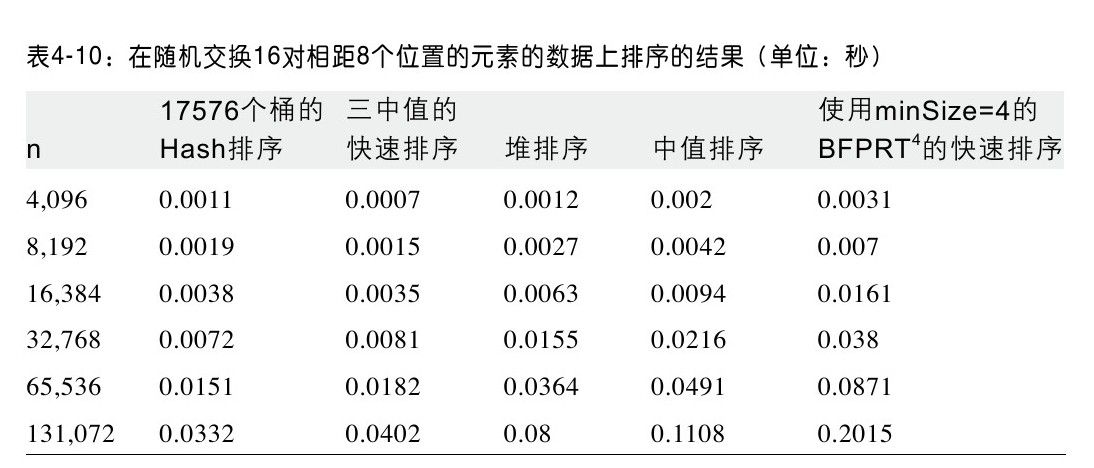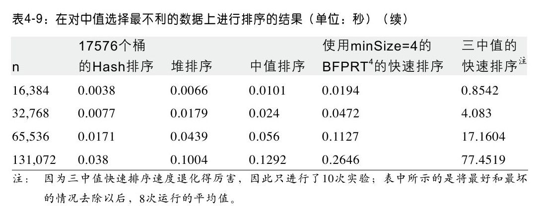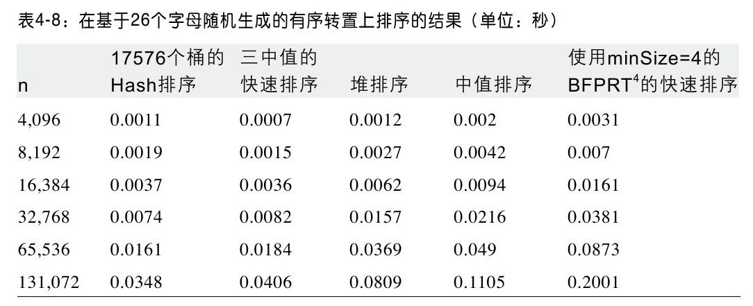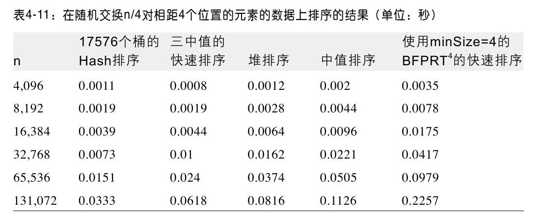 因为插入排序和选择排序是本章中在随机均匀数据(提升一些数量级)最慢的两个算法,所以我们在表4-7~表4-11中忽略这两个算法。但是,这两个算法值得处理有序数据(表4-8)和几乎有序数据(表4-10和表4-11)。插入排序比其他算法表现要好,通常要快一个数量级。为了得到表4-7~表4-11的结果,我们在高端计算机上执行了100次实验,抛弃最好和最坏的结果,把剩下的98次结果的平均值填在表中。标记为Quicksort BFPRT4minSize=4的列表示一个快速排序的实现,它使用了BFPRT(集合大小为4)来选择切分值,并且在子数组规模少于4个元素的时候切换到插入排序。