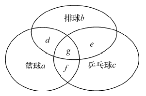 设a为仅参加篮球队一项训练的人数;b为仅参加排球队一项训练的人数;c为仅参加乒乓球队一项训练的人数;d为参加篮球、排球两项训练的人数;e为参加排球、乒乓球两项训练的人数;f为参加篮球、乒乓球两项训练的人数;g为参加篮球、排球、乒乓球三项训练的人数。则有: