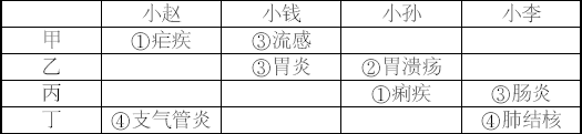 ④因为四位实习生中,有一位诊断全对,一位诊断全错,而小钱、小孙的诊断都不全对也不全错,小赵已有一种诊断正确,小李已有一种诊断错误,因此,只能是小赵诊断全对,小李诊断全错。
