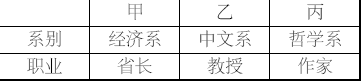 从题目条件知道,两个不相容选言命题“要么毕业于哲学系,要么毕业于经济系,要么毕业于中文系”和“要么是作家,要么是教授,要么是省长”对于甲、乙、丙都成立。